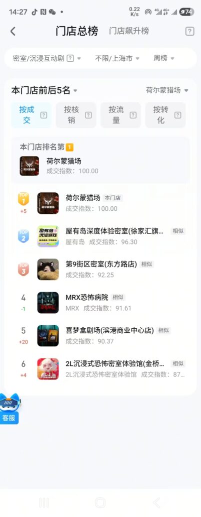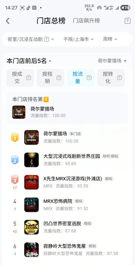 涞坊数字实境沉浸游戏《荷尔蒙猎场》在抖音上海市沉浸剧场榜成交第一名